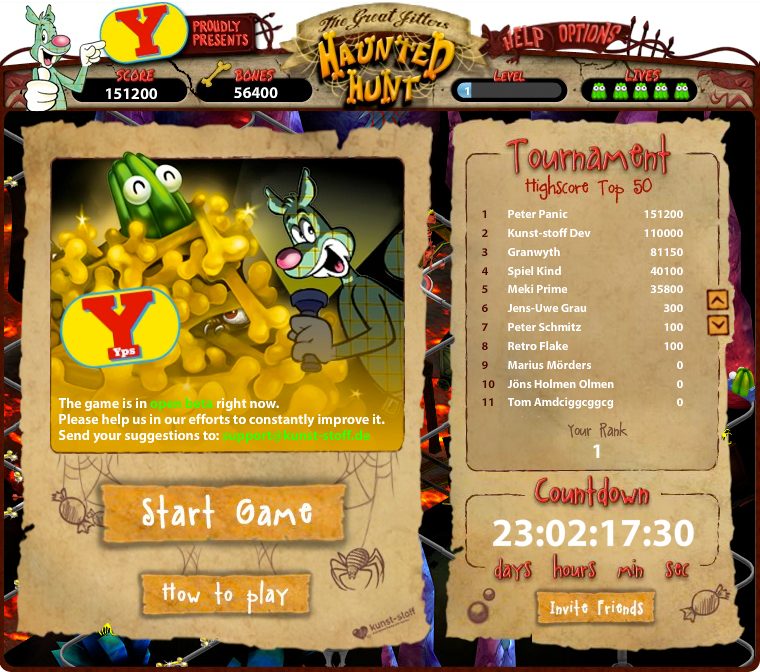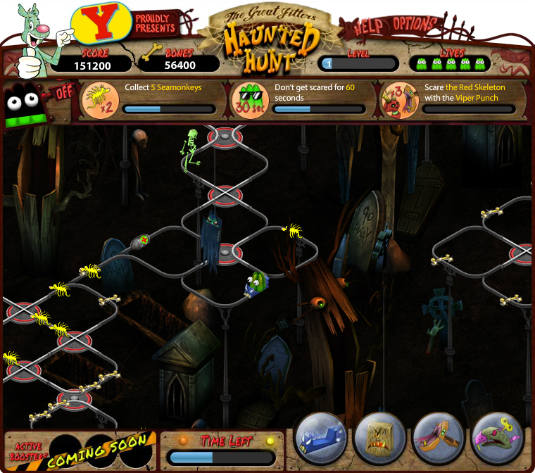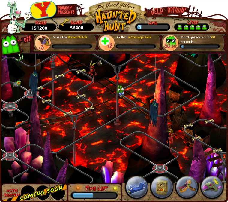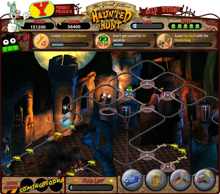 “The Great Jitters: Haunted Hunt” is a tricky action-puzzle game that demands quick reflexes to use the right weapons and work the railway switches to collect boosters and other tokens. Players who master this challenge can invite their Facebook friends to see who is the best and fastest at navigating the haunted house! “The Great Jitters: Haunted Hunt” poses a perpetual challenge to collect goodies, scare your foes and outrace your friends.
