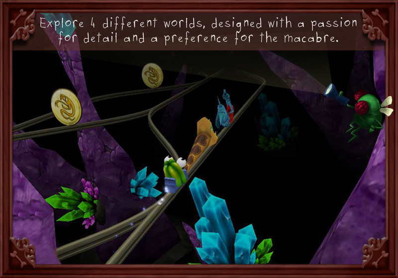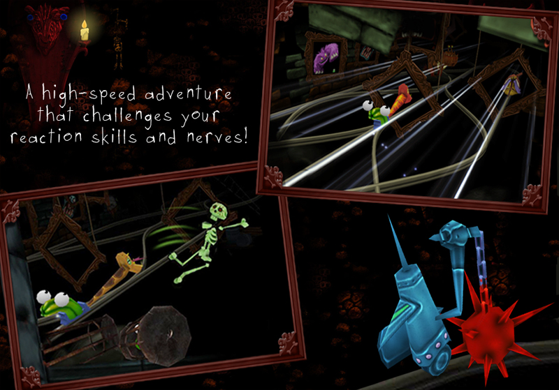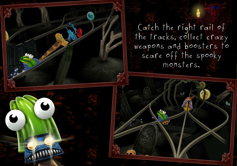 The quirky action racing game, starring an anxious jelly in a scary ghost train! PANIC RIDE takes you on a high-speed adventure through the creepy worlds of a haunted house. How long can you survive until your jelly faints from fear? Tilt your iPhone/iPad in order to catch the right rail of the tracks, use your crazy super-weapons to scare off monsters along the way, and try to survive for as long as possible!